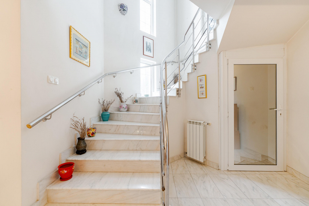 Etaj: dormitor matrimonial de 26 mp, alte două dormitoare, baie și trei balcoane – două cu vedere deschisă către grădina mănăstirii din vecinătate și unul către grădina casei și piscină.